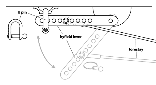 Anyhoo, you clevis pin the forestay in the hyfield lever slot at the holes you select. It should fit between the 2 metal pieces of the lever.