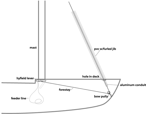 The jib is wrapped/furled around the pvc/conduit and slid onto the forestay. The forestay is attached near the top of the mast at one end, then runs to the bow, through a hole in the deck down below, through a block/pulley, then back to the hyfield lever at the cuddy opening. (See attached drawing)